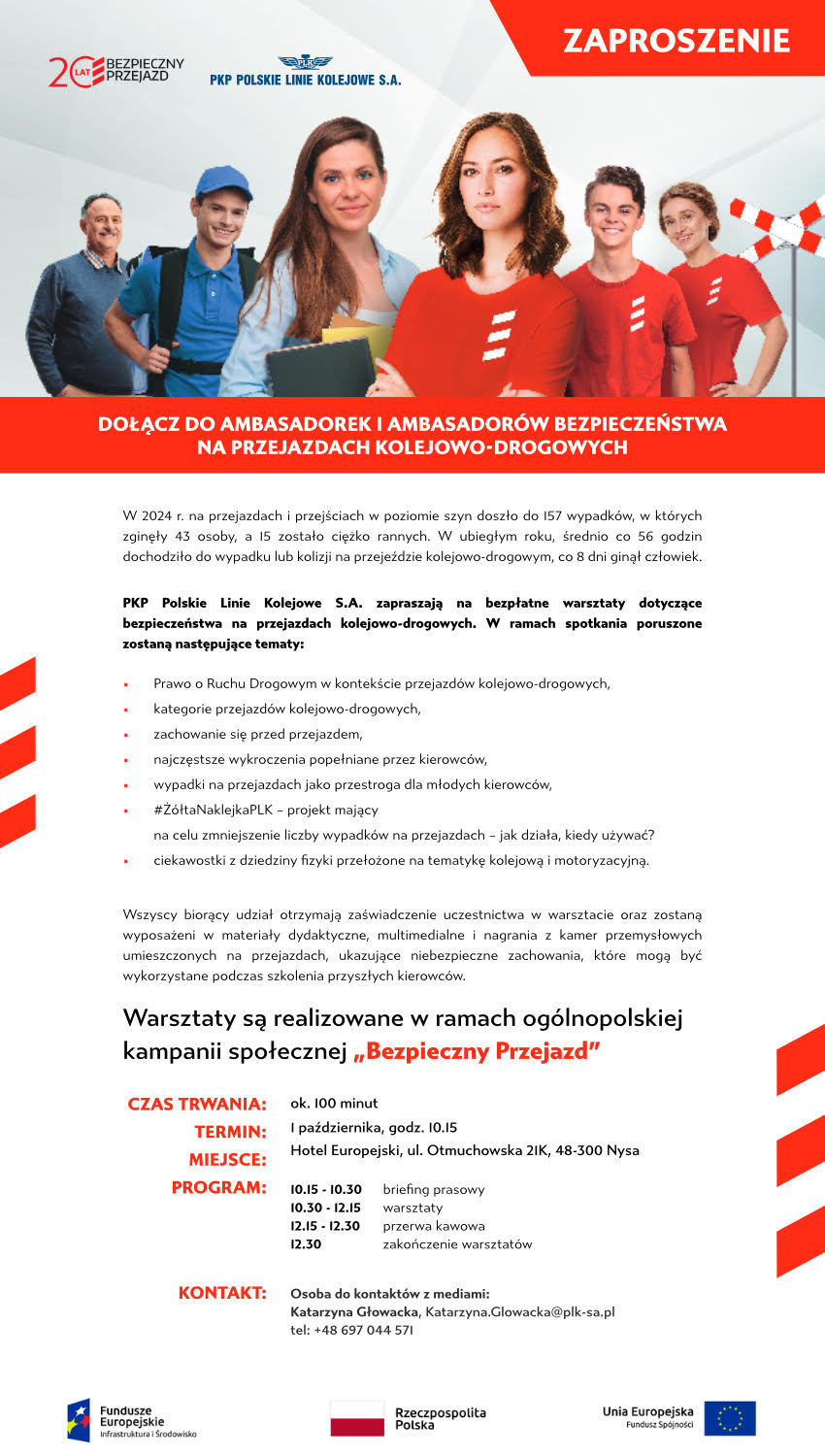 Aby poprawić bezpieczeństwo na torach, PKP Polskie Linie Kolejowe S.A. zapraszają do udziału w bezpłatnych warsztatach poświęconych bezpieczeństwu na przejazdach kolejowo-drogowych. Spotkania odbywają się w ramach ogólnopolskiej kampanii społecznej „Bezpieczny Przejazd”, której celem jest uświadamianie kierowców, pieszych oraz przyszłych użytkowników dróg, jak ważna jest ostrożność przy przekraczaniu torów.