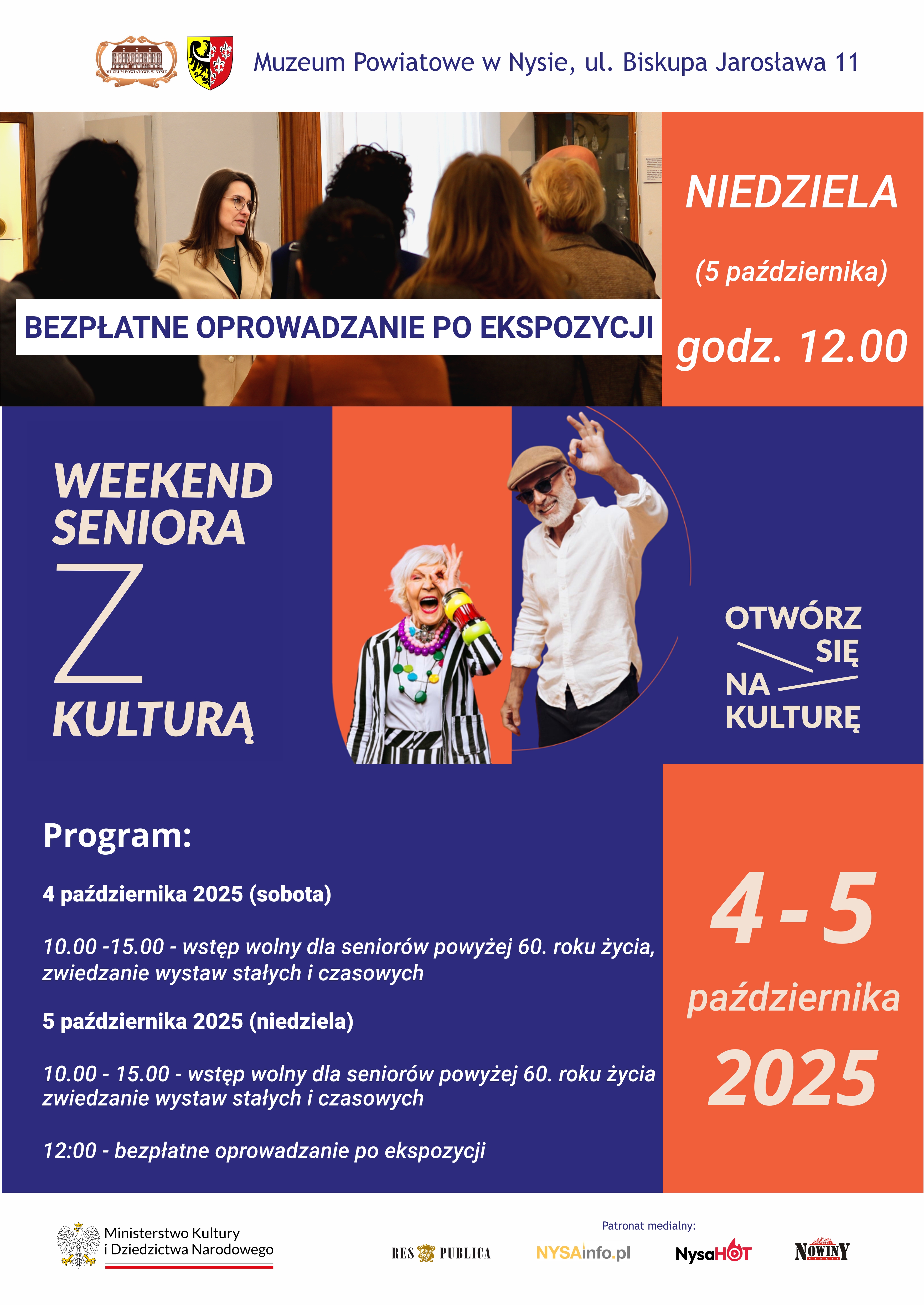 Z tej okazji placówka zaprasza osoby powyżej 60. roku życia do bezpłatnego zwiedzania muzeum w dniach 4–5 października 2025 r. Szczególnym punktem programu będzie niedzielne oprowadzanie z przewodnikiem, które rozpocznie się o godz. 12.00. Uczestnicy będą mieli okazję wysłuchać barwnych opowieści o wystawach stałych oraz czasowych.