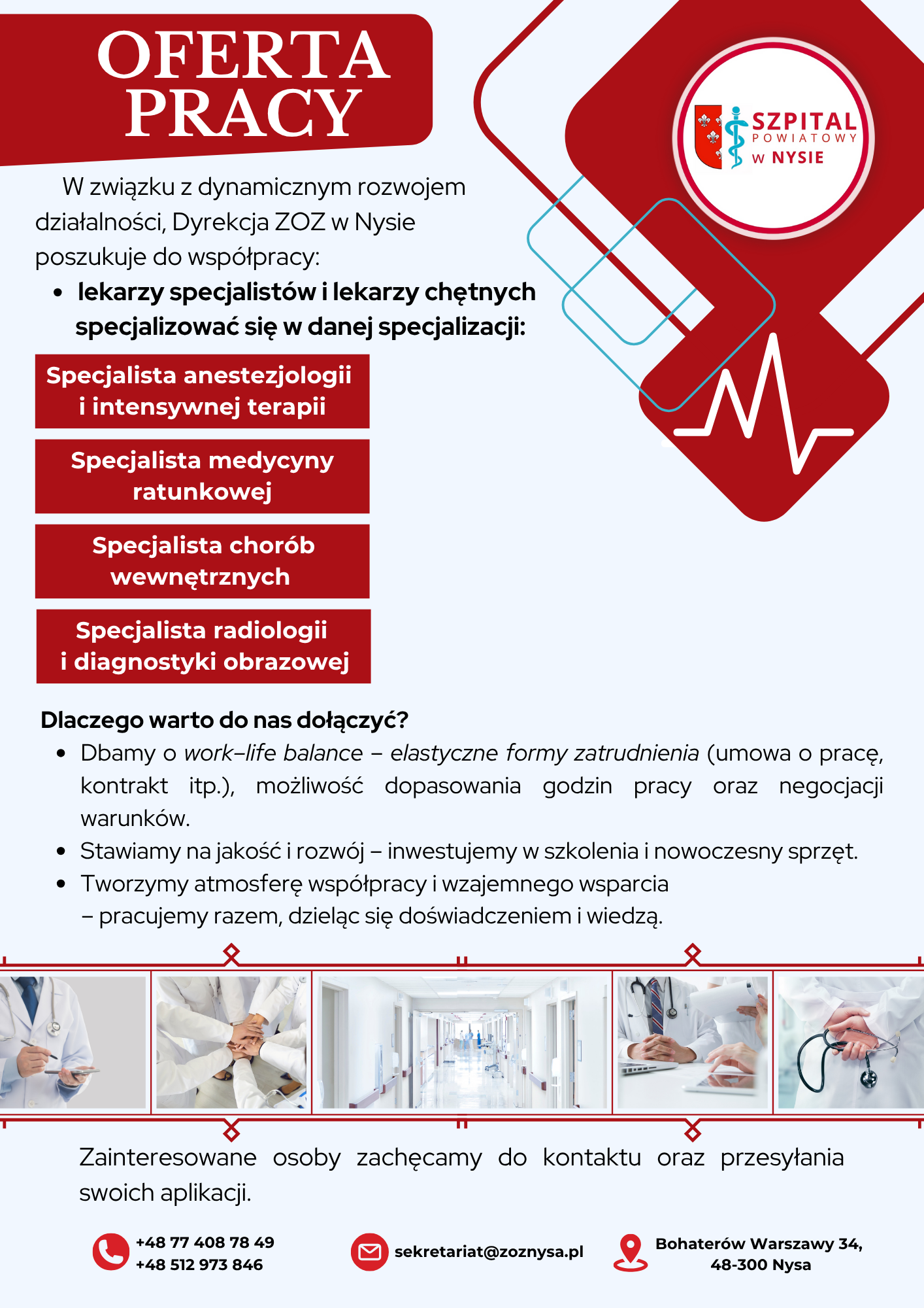 Nyski szpital zaprasza do współpracy lekarzy specjalistów i lekarzy chętnych specjalizować się w danej specjalizacji: