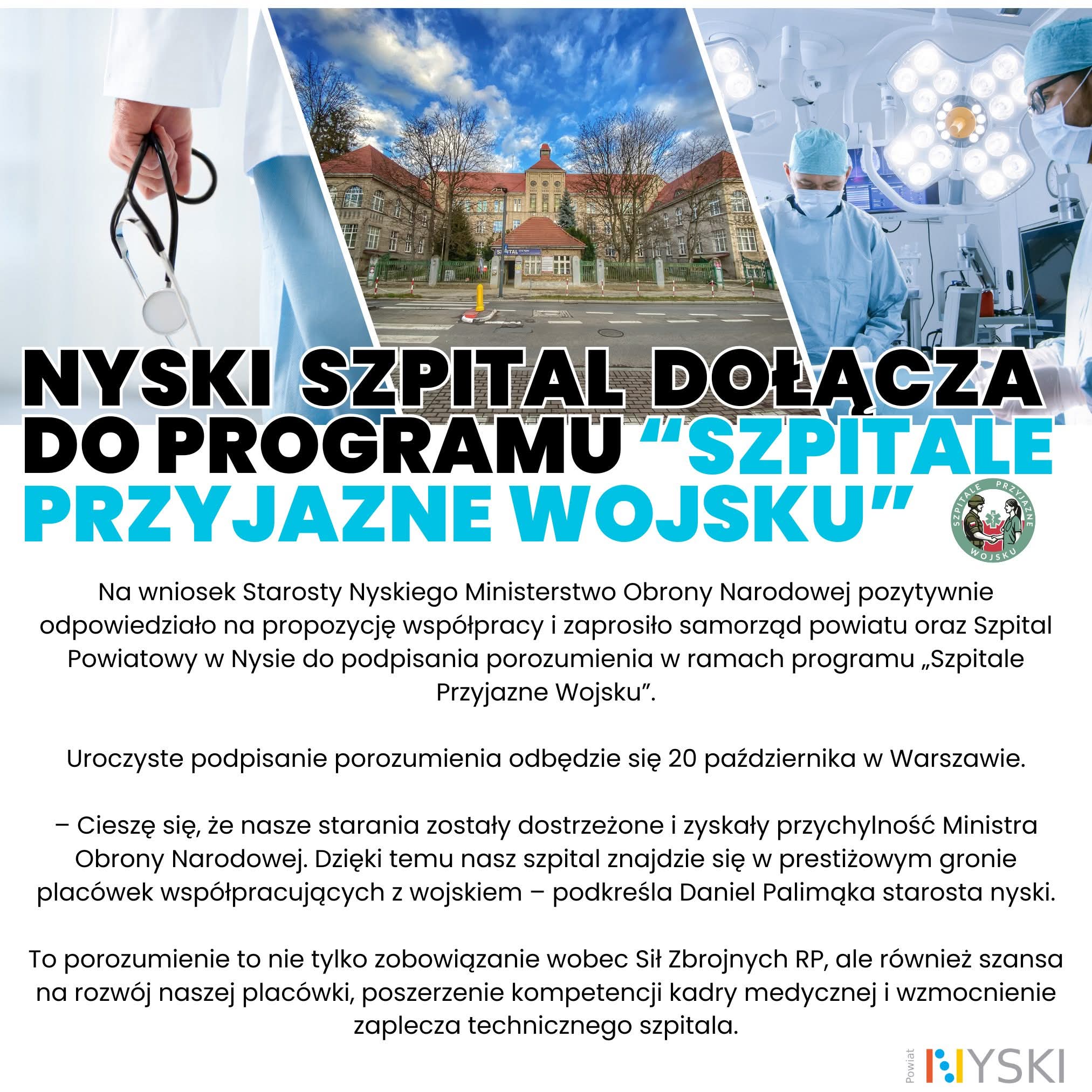 Uroczyste podpisanie porozumienia między resortem obrony, samorządem powiatu i nyskim szpitalem odbędzie się 20 października w Warszawie.