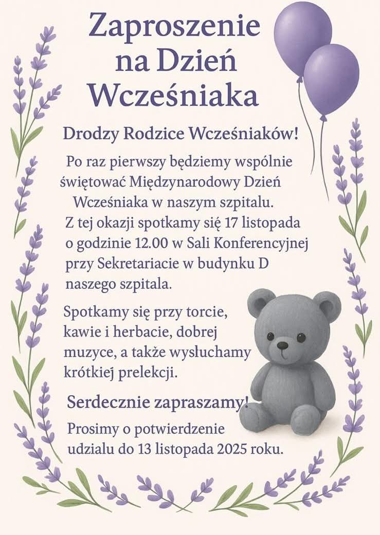 W tym roku szpital po raz pierwszy organizuje obchody Międzynarodowego Dnia Wcześniaka, wyjątkowego święta dedykowanego najmłodszym i najsilniejszym pacjentom oraz ich rodzicom. Spotkanie odbędzie się 17 listopada o godz. 12:00 w Sali Konferencyjnej przy Sekretariacie w budynku D.