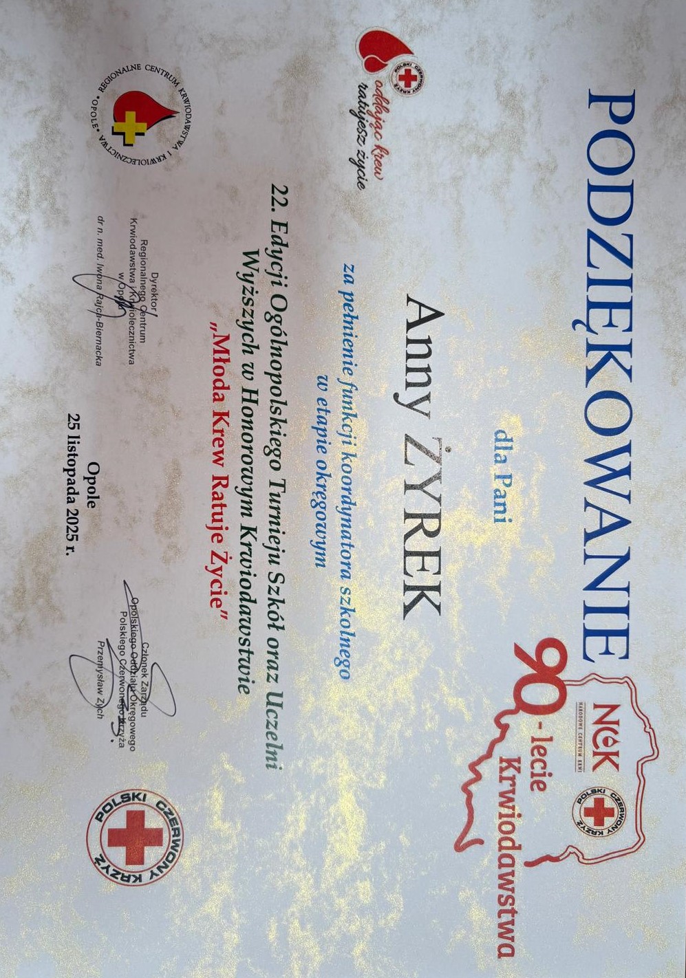 Podczas uroczystości podziękowanie za pełnienie funkcji koordynatora szkolnego w etapie okręgowym odebrała Anna Żyrek, nauczyciel i opiekun Szkolnego Koła HDK PCK „Kropelka” przy ZSE w Nysie.