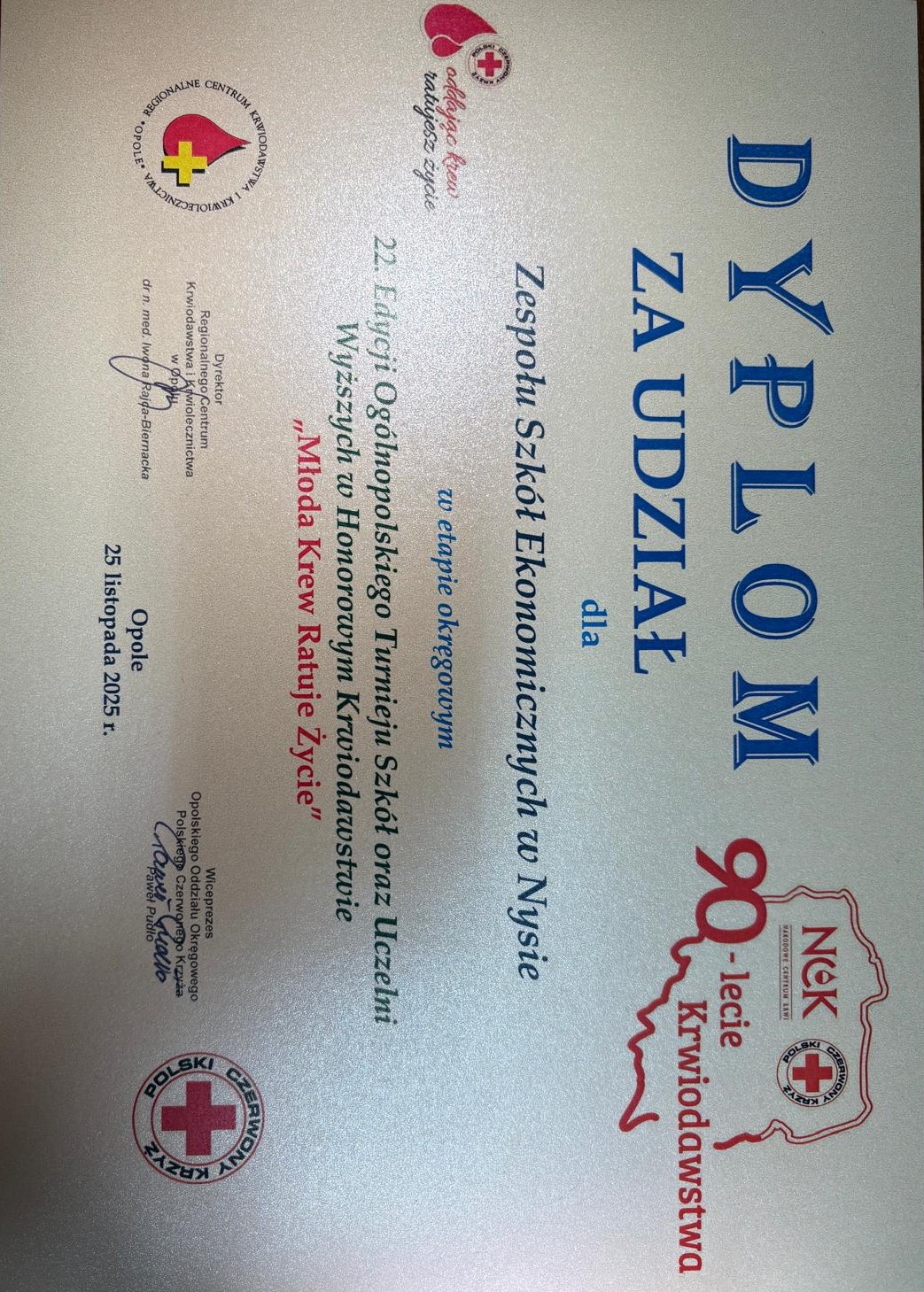 Zespół Szkół Ekonomicznych w Nysie, dzięki zaangażowaniu uczniów, nauczycieli oraz opiekunów, łącznie oddał ponad 33 litry krwi pełnej. Placówki oceniano według wskaźnika aktywności, liczonego jako ilość oddanej krwi w przeliczeniu na jednego pełnoletniego ucznia. Uczniowie „Ekonomika” osiągnęli w tym zestawieniu wysokie 6. miejsce w województwie.