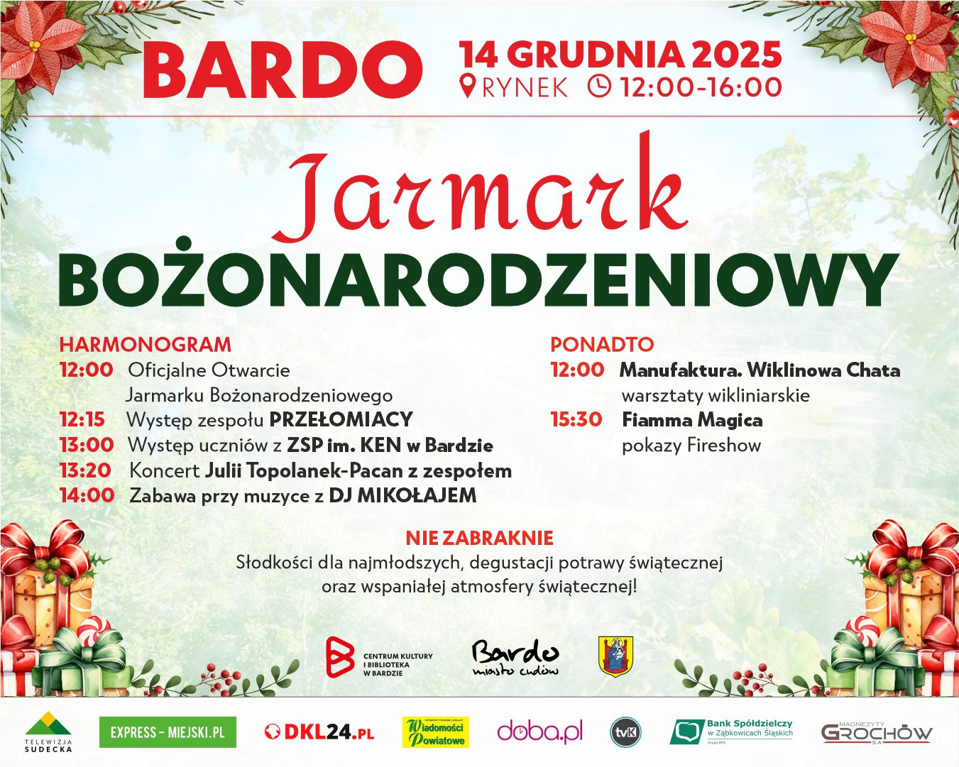 Na jarmarku nie zabraknie stoisk z rękodziełem, świątecznymi dekoracjami oraz regionalnymi przysmakami. Dla najmłodszych przewidziano słodkości, a dla wszystkich odwiedzających degustację potraw kojarzących się ze świątecznym stołem. To doskonała okazja, by poczuć atmosferę zbliżających się świąt i spędzić czas w wyjątkowej scenerii.