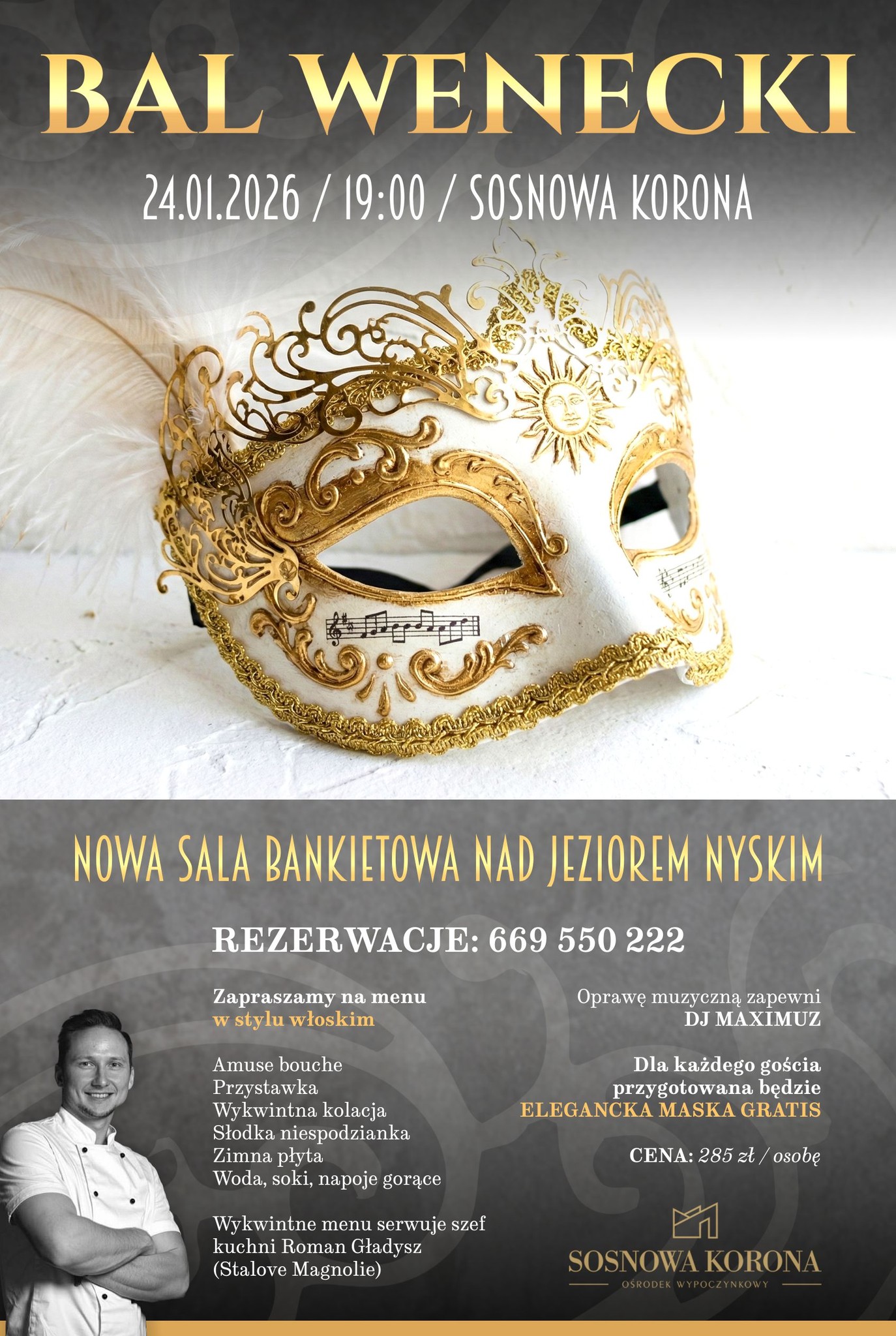 Każdy gość otrzyma w prezencie maskę wenecką, która podkreśli tajemniczy charakter wydarzenia. Nowa sala bankietowa nad Jeziorem Nyskim zapewni komfortowe warunki i klimatyczne otoczenie dla wszystkich uczestników. Istnieje także możliwość rezerwacji domku w ośrodku Sosnowa Korona, co pozwoli cieszyć się nocą bez pośpiechu.