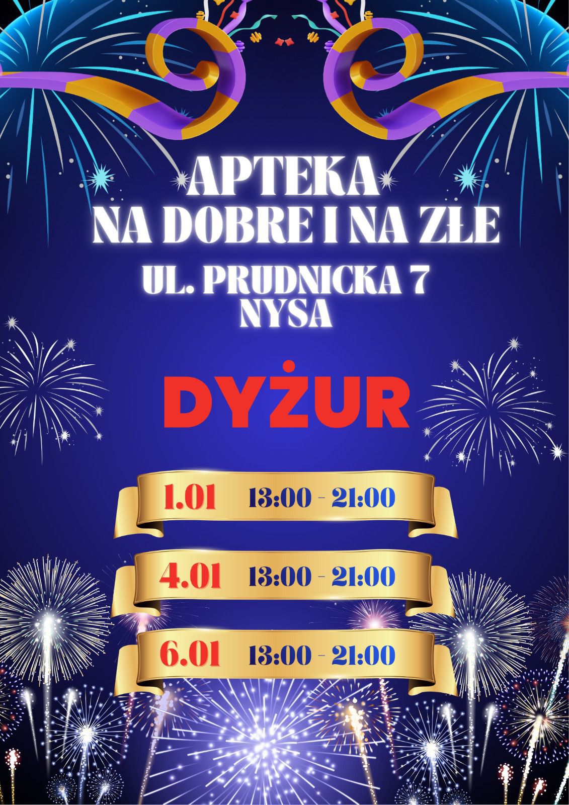 Apteka „Na Dobre i Na Złe” w Nysie, przy ul. Prudnickiej 7, zaplanowała dyżury na początek stycznia.