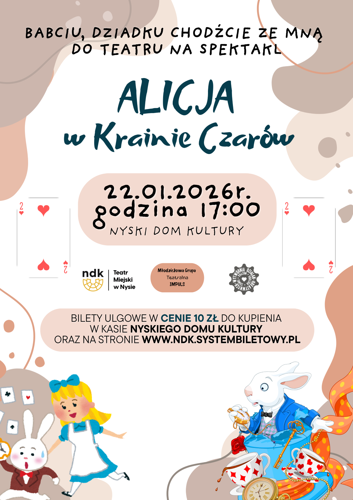 Na scenie ożyje znana i lubiana historia o dziewczynce, która podąża za ciekawością i trafia do niezwykłej krainy rządzącej się własnymi prawami. Spektakl „Alicja w Krainie Czarów” to barwna opowieść pełna zaskakujących bohaterów, symbolicznych sytuacji i przygód, które bawią najmłodszych, a starszym dają przestrzeń do refleksji.