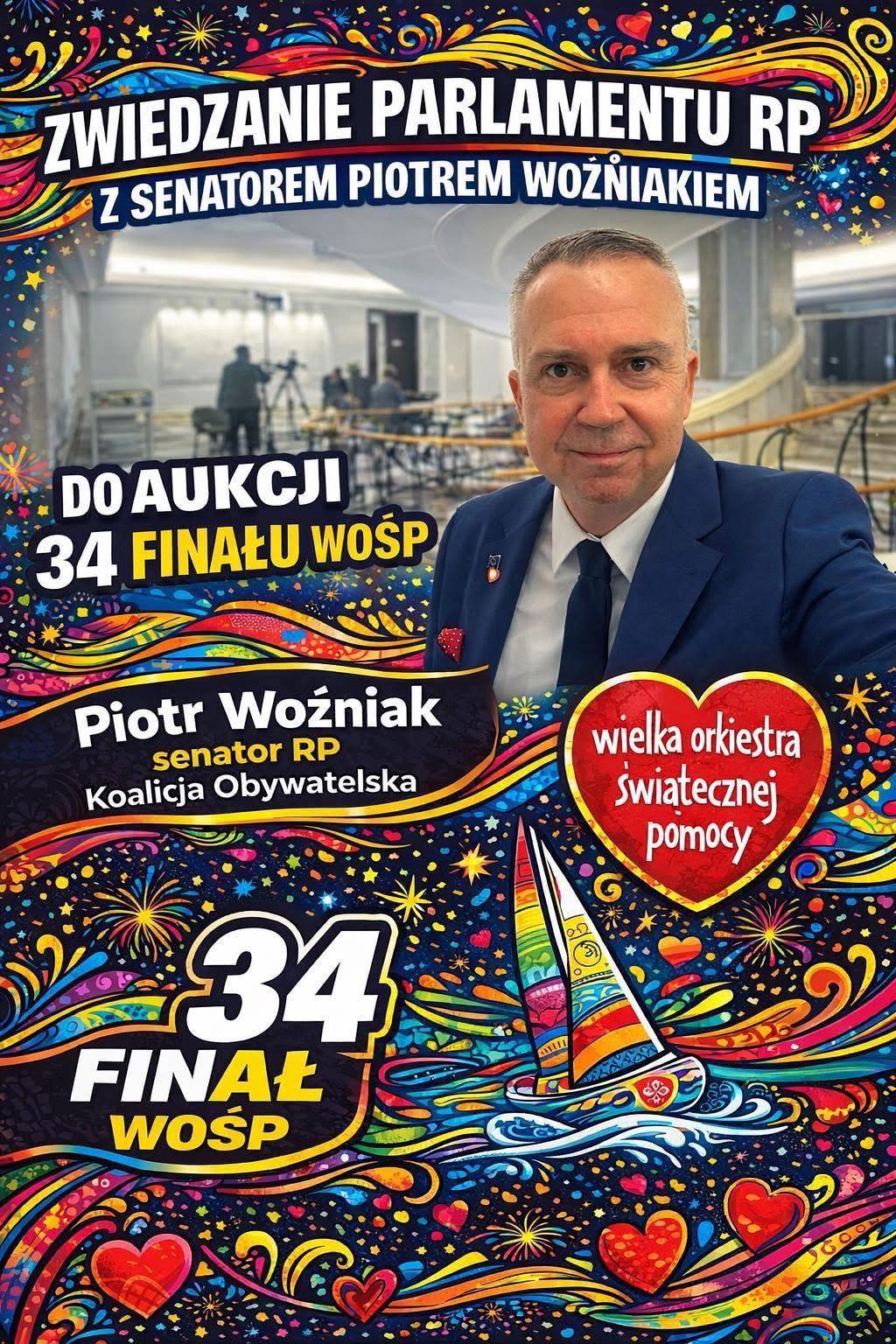Oprócz aukcji pozwalającej na odwiedzenie Parlamentu, podczas 34. Finału WOŚP dostępnych jest wiele innych wyjątkowych propozycji, które przyciągają uwagę kolekcjonerów i osób szukających niezapomnianych doświadczeń. Wśród nich znajdują się między innymi rakieta i ręcznik z Wimbledonu 2025 od Igi Świątek, nocowanka z Julią Wieniawą, spotkanie z Donaldem Tuskiem w KPRM, koszulka meczowa Roberta Lewandowskiego, wycieczka rowerowa z Radosławem Sikorskim, a także możliwość zatańczenia poloneza z Maćkiem Musiałem.