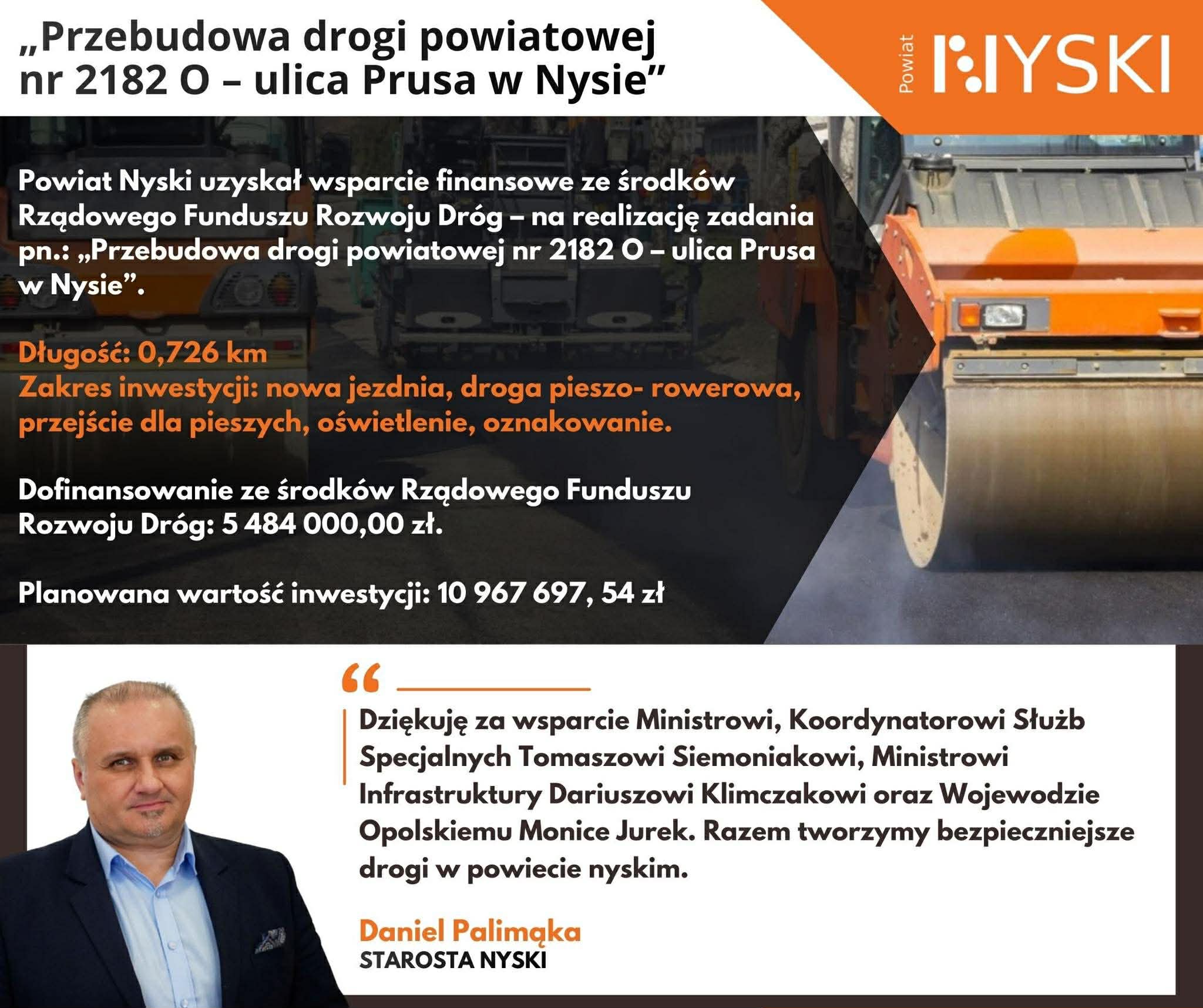 Powiat Nyski znalazł się w gronie samorządów, które otrzymały wsparcie z Rządowego Funduszu Rozwoju Dróg. Dofinansowanie w wysokości 5 484 000 zł zostanie przeznaczone na przebudowę drogi powiatowej nr 2182 O – ulicy Prusa w Nysie.